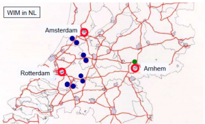 Cartogram: Blue dots indicate WIM stations installed on the Dutch road network